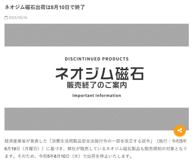 磁石を取り扱うハイキューパーツ社は16日、「弊社が販売しているネオジム磁石製品も販売規制の対象となります」と発表し、8月10日での出荷停止を告知した。SNSでは「DIY/ハンドメイド界隈はかなりの衝撃かもしれない」「ミニチュアにほぼ必須なんですけど」と影響の大きさを危惧する声が続出し、買いだめを推奨する投稿もあった。