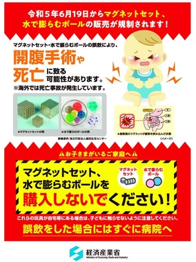 そのため、乳幼児が飲み込みうる大きさで、誤飲しても自然排出されない水準の磁石は、23年6月19日から販売できなくなる。
