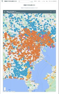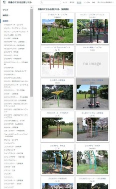 懸垂のできる公園は、Google マップを活用してリスト化されている。赤いピンで示される場所は、公園の鉄棒さんが実際に訪問し、自ら撮影した写真を掲載している。青色のピンは未訪問、黄色いピンは情報提供で寄せられた写真を掲載していることを示す。遊具の種類や設置場所で懸垂のできる公園を探すこともできる。