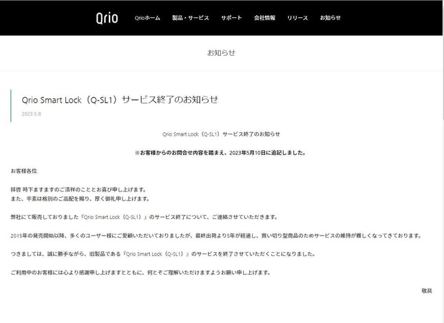 「2015年の発売開始以降、多くのユーザー様にご愛顧いただいておりましたが、最終出荷より5年が経過し、買い切り型商品のためサービスの維持が難しくなってきております。 つきましては、誠に勝手ながら、旧製品である『Qrio Smart Lock(Q-SL1)』のサービスを終了させていただくことになりました」