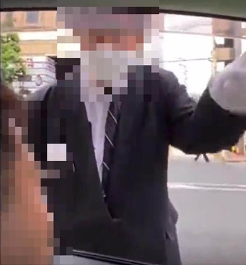 投稿者がスマートフォンで自身の動画を撮っていると、スーツ姿のタクシーの男性運転手が運転席の窓をコツコツと叩く。