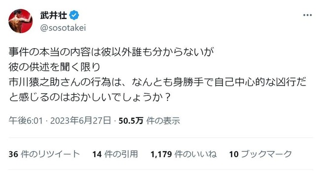 武井さんはツイッターで、「事件の本当の内容は彼以外誰も分からない」と前置きしつつ、「彼の供述を聞く限り市川猿之助さんの行為は、なんとも身勝手で自己中心的な凶行だと感じるのはおかしいでしょうか?」とコメントした。
