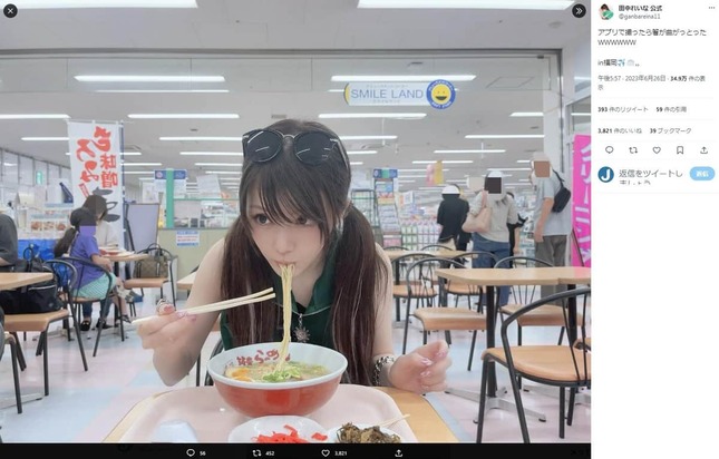 田中さんはツイッターに、フードコートと思われる場所でラーメンを食べている自身の写真を投稿。アプリの加工のせいか、箸の先端がぐにゃりと曲がっており、よく見ると不自然な画像となってしまっていた。
