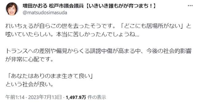 千葉・松戸市議の増田かおる氏が2023年7月12日、「れいちぇるが自らこの世を去ったそうです」などとツイッターに投稿して物議をかもしている件で、増田氏は13日、「お名前を間違えて書いてしまい、本当に申し訳ありませんでした」と謝罪した。
