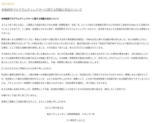 発表によれば、7月28日に遺族から死去を伝えられた俳優・映画監督が、生前「K」という人物から性被害を受けたとツイッター(現X)で告発していたという。その後、加害者とされる人物が金子氏ではないかとSNSで広がったとしている。
