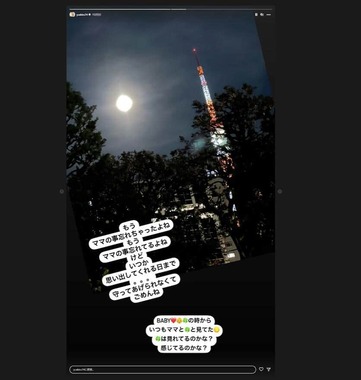 投稿には東京タワーと月の写真がアップされていたが、あびるさんは「BABYの時からいつもママと見てた」と、赤ちゃんの長女とともによく月を見てたことを振り返り、「見れてるのかな?」「感じてるのかな?」とつづっていた。