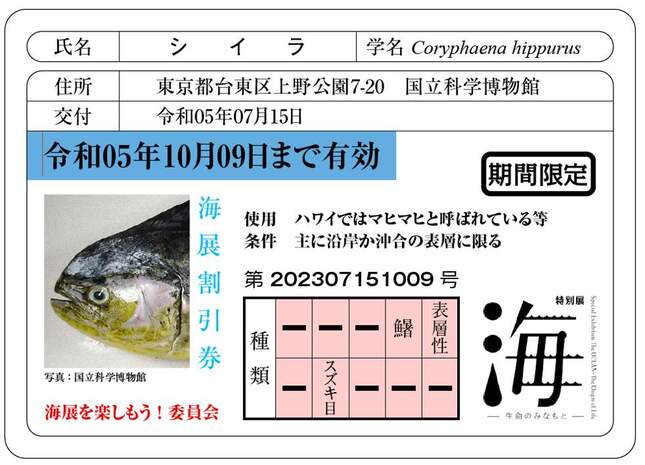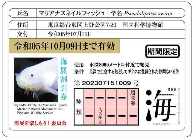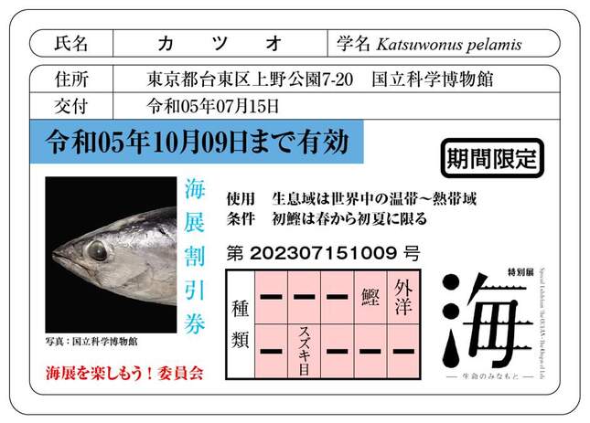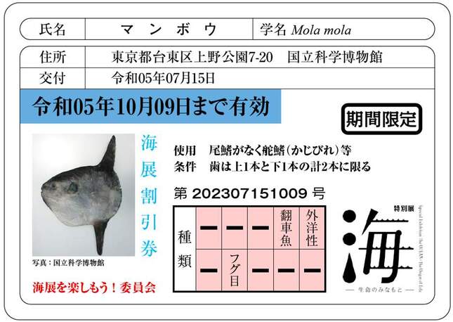 飲食店に「魚の免許証」が置いてあったとSNSで話題になっている。カツオやマンボウといった魚の免許証風のカードで、国立科学博物館が住所として記されている。実は、同館で開催中の特別展「海 ―生命のみなもと―」(以下「海展」)の入場割引券だという。上野駅周辺の商業施設で配布されている。