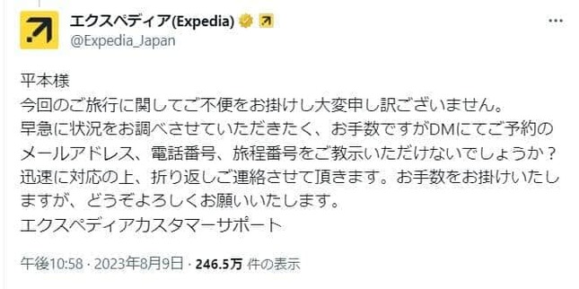 一方、平本さんのポスト連投後、エクスペディアの公式Xはようやくこの騒動に反応し、平本さんに謝罪。「早急に状況をお調べさせていただきたく、お手数ですがDMにてご予約のメールアドレス、電話番号、旅程番号をご教示いただけないでしょうか?」と返信した。