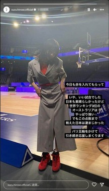 広瀬さんはオーストラリア戦前にテレ朝バスケ公式X(ツイッター)アカウントに投稿された動画に登場。アナウンサーらと試合前の気合を入れたり、応援コメントを述べたりしていた。