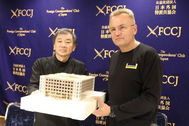 建築家の坂茂氏とウクライナ・リビウ市のアンドリー・サドビー市長が2023年9月5日、東京・丸の内の日本外国特派員協会で記者会見し、市内の病院で新たな建物を建設する構想を披露した。