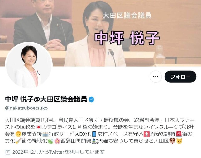 自民党の中坪悦子・大田区議会議員(50)が2023年9月10日、自身が投稿し物議を醸した「いまこそジャニーズを応援しようよ」などとする投稿の主旨について釈明した。