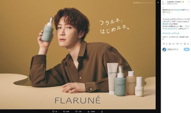 そんな中で、8月にSnow Manの渡辺翔太さん(30)を、新商品「フラルネ」をPRするアンバサダーに起用したアルビオンの小林社長には、ファンから起用を継続してほしいとのリプライが届いた。これに対し、小林社長は9月9日、渡辺さんに「本当に感謝してます」として、「これからもよろしくお願いします!」と継続の意思を示した。