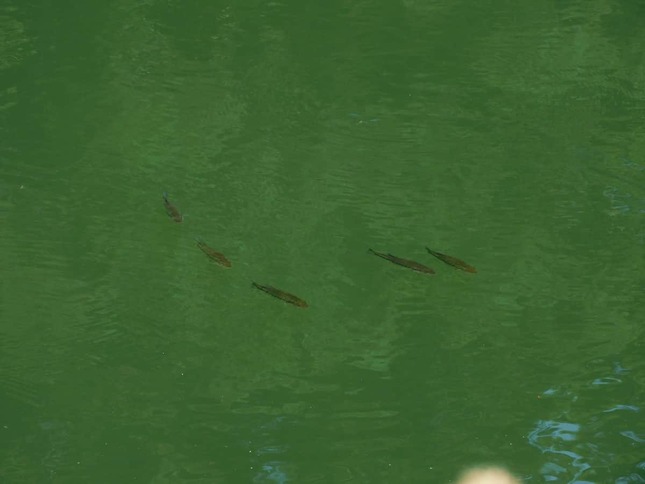 池の表層近くで、大きなオオクチバス(ブラックバス)が群れをなして泳いでいる。
