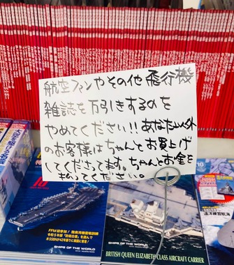 航空関係の本が充実していることで知られ、愛好者が「閉店しかねない」と危惧して掲示の写真を投稿した。犯行の手口も巧妙で、店も難儀している様子だ。
