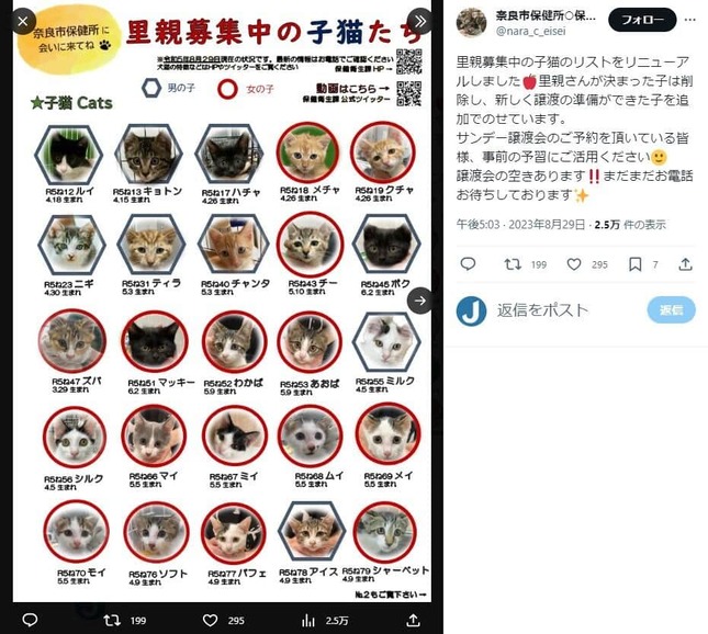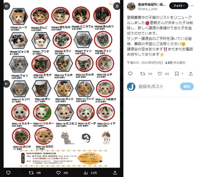Xでは2023年9月下旬、奈良市からこうした保護猫の譲渡会のお知らせが公式LINEでも送られてくるとして話題を呼んだ。「名付けの天才」「こういう見せ方は、里親になりたい気持ちを湧かせるからイイね」「市でこんなに手厚く募集や譲渡会してくれるなんてすごい」「とても良い取り組み」といった声が出ている。