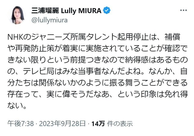 — 三浦瑠麗 Lully MIURA (@lullymiura) September 28, 2023