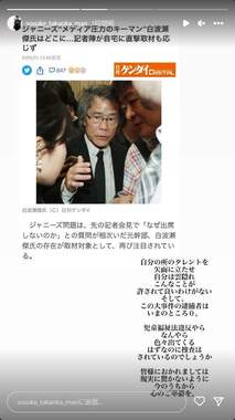高岡さんは、日刊ゲンダイDIGITALが9月25日に報じていた「ジャニーズ"メディア圧力のキーマン"白波瀬傑氏はどこに...記者陣が自宅に直撃取材も応じず」という記事を引用し、「自分は雲隠れ こんなことが許されて良いわけがない」などと批判した。