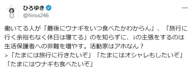 「働いてる人が『最後にウナギをいつ食べたかわからん』、『旅行に行く余裕もなく休日は寝てる』のを知らずに、↓の主張をするのは生活保護者への非難を増やす。活動家はアホなん?>『たまには旅行に行きたいぞ』『たまにはオシャレもしたいぞ』『たまにはウナギも食べたいぞ』」