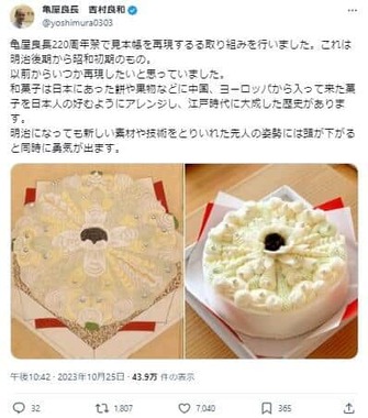 戦前に記されたレシピをもとに製作されたケーキの写真が大きな注目を集めている。老舗和菓子店「亀屋良長」の8代目店主・吉村良和さんが2023年10月23日、X(旧ツイッター)で紹介した。