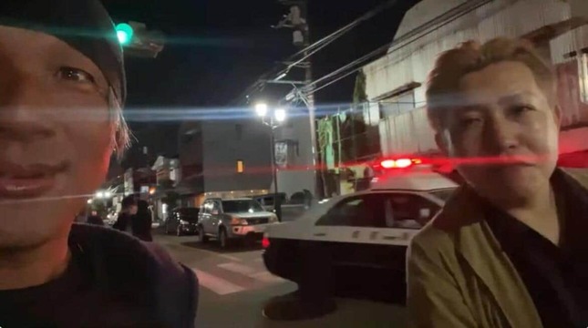 記者が現場の様子を伝える中、スマートフォンを片手にニヤニヤ笑いを浮かべた男性2人が画面に映り込んできた。「煉獄コロアキ」「黒い彗星」を名乗り活動するYouTuberだ。