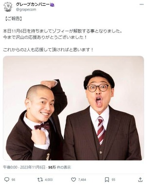 お笑いコンビ「ゾフィー」が、2023年11月6日をもって解散した。所属事務所のグレープカンパニーが同日発表した。