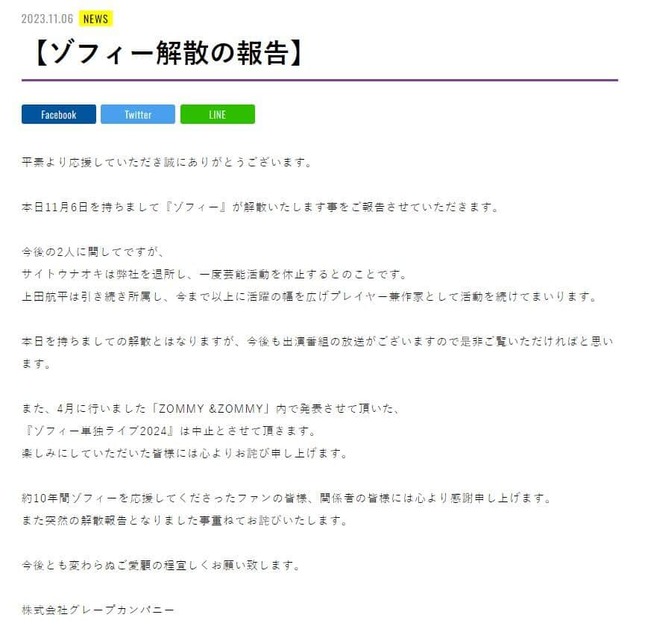 一方、開催予定だった「ゾフィー単独ライブ2024」は中止になるという。