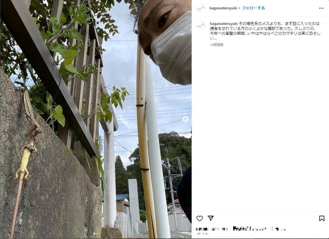 香川さんは19日夜のインスタグラムに、茶褐色のカマキリがトカゲのような生物を捕食している様子を見つめる自身の写真を公開。「その褐色系のメスよりも、まず目に入ったのは捕食をされている方のふくよかな腹部であった」とつづった。また、捕食している様子をアップで映したショットも掲載した。