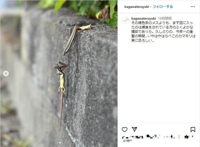 このカマキリの様子に香川さんは、「久しぶりの、今年一の衝撃の瞬間...」と驚きをあらわにしつつ、「いやはやはらぺこのカマキリは実に恐ろしい...」と感想をコメントした。