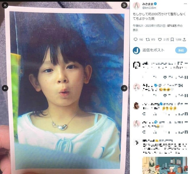 ファッション雑誌「小悪魔ageha」元モデルでインフルエンサーの黒崎みささんが2023年11月21日、X(旧ツイッター)で、整形後と幼少期を比較したショットを「もしかして約2000万かけて整形しなくてもよかった説」として公開し、幼い頃の写真に「なんで整形しようと思ったのか謎」などと驚く声が寄せられている。