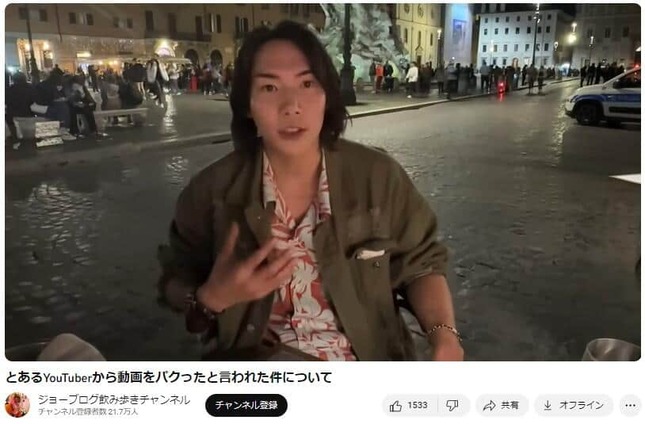 YouTuber・ジョーブログさん(メインチャンネル登録者数217万)が2023年11月21日、同業者のYouTuberからある場所に関する動画内容やサムネイルの構図を「丸パクリ」した1人として名前を挙げられたことを受け、サブチャンネルに公開した動画で「参考にしました」と詫びつつ「丸パクリって言われるのは心外」などと話した。