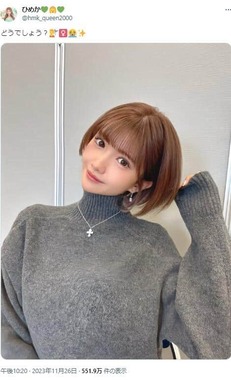 人気キャバクラ嬢・ひめかさんが2023年11月26日、X(旧ツイッター)で顎ラインで切りそろえられたショートカットを披露した。