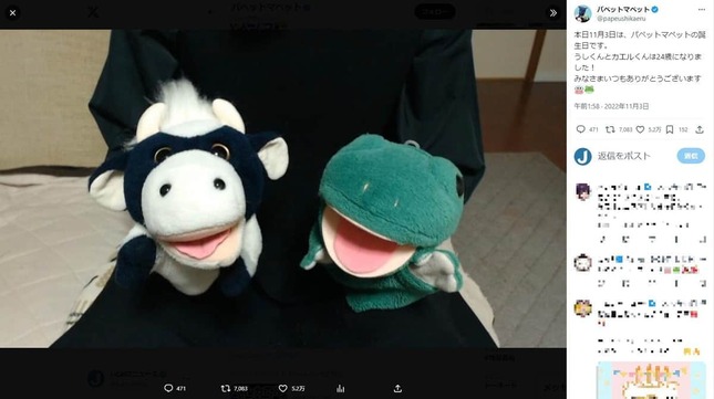 お笑い芸人・パペットマペットさんが「いい肉の日」である2023年11月29日にX(旧ツイッター)を更新。「うしくん、ありがとう」のコメントとともに公開された写真に、ファンから反響が寄せられた。