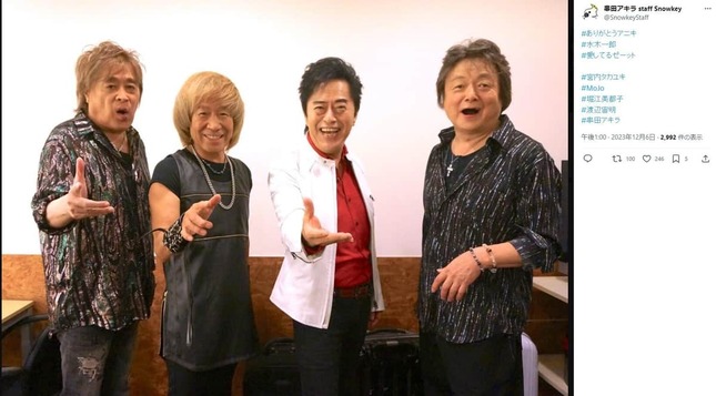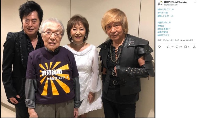 その後、「#ありがとうアニキ #水木一郎 #愛してるゼーット」とのハッシュタグとともに、宮内タカユキさん、MoJoさん、堀江美都子さんと、22年6月23日に亡くなった作曲家の渡辺宙明さんと、串田さん、水木さんが写った写真も公開した。