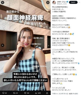 10日の投稿では、「左顔面神経麻痺闘病中に心無いコメントの一部」とし、一部のSNSユーザーの声をスクリーンショットして取り上げた。その中には、「なんでそんな口いがんでるねん笑」「口の片方の開き具合不均衡でキニナル」「この子クチが歪んでる」といったコメントが見られた。