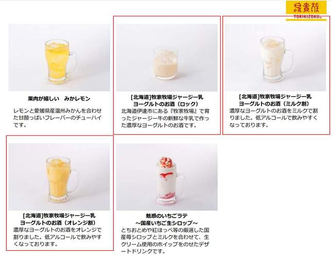 問題になったのは、鳥貴族が販売する「牧家牧場ジャージー乳ヨーグルトのお酒」のロック・ミルク割・オレンジ割(各税込360円)だ。