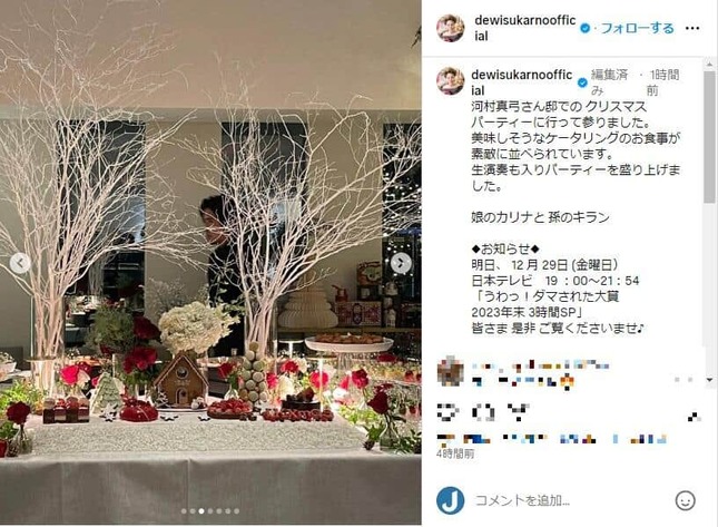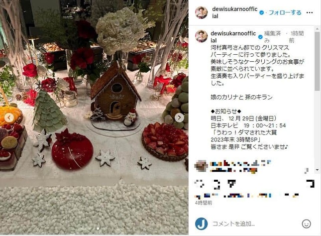 デヴィ夫人は「本日は河村真弓さん邸での クリスマスパーティーに行って参りました」と報告しつつ、パーティー中の写真を7枚投稿。「美味しそうなケータリングのお食事が素敵に並べられています。生演奏も入りパーティーを盛り上げました」と感想をつづった。