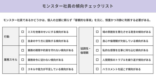 そこでアスマークが作ったのが、早期発見のための「モンスター社員の傾向チェックリスト」だ【図表1】。「あいつはモンスター社員かもしれない」などと個人の主観で決めつけずに、客観的な事実を元に、慎重かつ冷静に判断することが求められる。