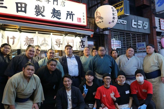 全部のせ特濃つけ麺がテーブルに届けられると、力士たちは手を合わせて「ごっちゃんです」と言い、食事を開始。一心不乱にスープにつけた麺をすすり、撮影スタッフがカメラを向ければ「カツオが効いてて美味いっす」「魚介の味がめっちゃ濃厚です」「最高です」などと食レポした。その後も唐揚げ、たまごかけ麺、さらに追加オーダーした麺類まで、すべて綺麗に平らげた親方と力士たち。最後には「ごっちゃんでした」と、皆一様にお辞儀をしていた。