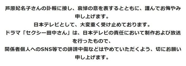 芦原さんは同局のドラマ「セクシー田中さん」(23年10~12月放送)の原作者で、26日にブログで、ドラマ化に際して提示していた脚本などに関する条件をめぐるドラマ制作側とのやり取りを明かし、その後29日に死去が報じられた。