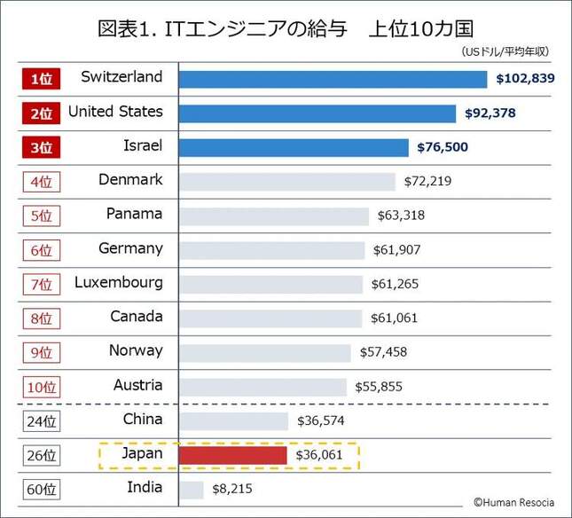 にもかかわらず、日本のITエンジニアの給与は「世界的に見ると決して高い方ではない」という調査結果もある。米ドルベースでは世界72か国のうち26位と低迷し、すでに中国を下回っているというが、本当にそんなに低いのだろうか。