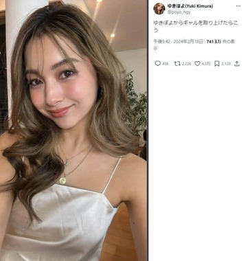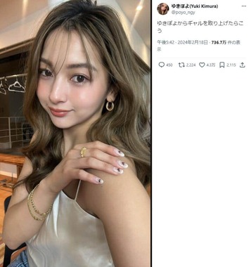 モデル・タレントの「ゆきぽよ」こと木村有希さんが2024年2月18日にXを更新し、普段のギャル風とは違うナチュラルなメイクの写真を公開して注目を集めている。