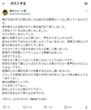 森川さんは20日にXを更新し、「僕が今回の件で口数が多いのは自分も加害者の一人だと思っているからです」と切り出し、