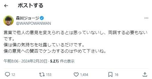続けて投稿したポストでは「言葉で他人の意見を変えられるとは思っていないし、同調する必要もないです。僕は僕の気持ちを吐露しているだけです」と補足し、「僕の意見への賛否でケンカするのはやめて下さいね」と釘を刺していた。