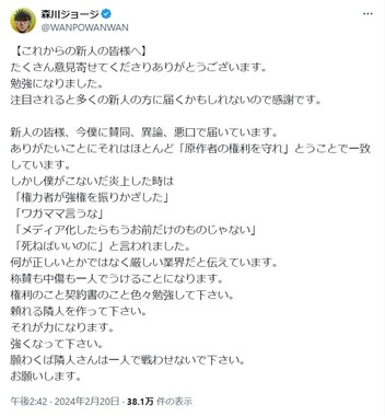 ドラマ「セクシー田中さん」(日本テレビ系)の原作者で漫画家・芦原妃名子さんが急死したことをめぐり、「はじめの一歩」で知られる漫画家の森川ジョージさんが2024年2月20日、新人漫画家に向け「強くなって下さい」などとXで呼びかけた。