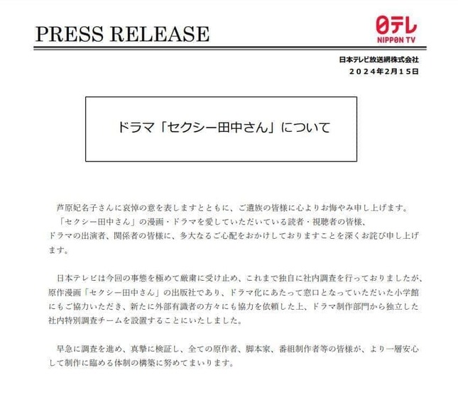同ドラマをめぐっては、芦原さんとドラマ制作陣の間でトラブルがあったとみられており、15日には日本テレビが公式サイトで「ドラマ制作部門から独立した社内特別調査チーム」の設置を発表している。
