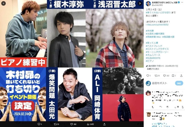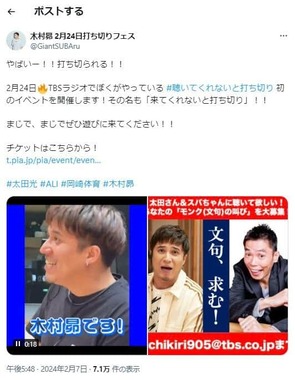 一方、24日に、声優・木村昴さんがパーソナリティを務めるラジオ番組「木村昴の聴いてくれないと打ち切り」(TBSラジオ)のリアルイベントにゲストの1人として出演が決まっている太田さん。爆笑問題カーボーイの番組ディレクターから、「木村昴(のチケット)売れてるんですか?」とプレッシャーをかけられたと告白する。
