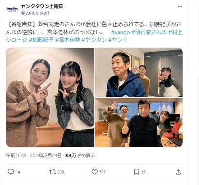 2024年2月25日には、明石家さんまさんのラジオ番組でのコメントに感謝をつづった。