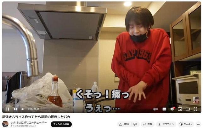ナナオさんは「最強オムライス作ってたら最恐の怪我したバカ」と題した動画を公開した。「皆さまにご報告があります。ナナオさん、半日前に動画を撮影した時に調子に乗って」と切り出し、