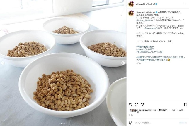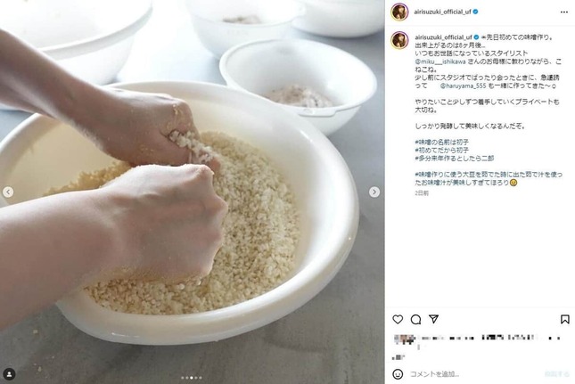 歌手で俳優の鈴木愛理さんが2024年2月24日にインスタグラムで、はじめて「味噌作り」に挑戦したことを報告した。実際の工程を写真で披露している。