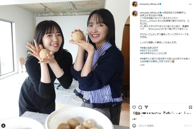 鈴木さんは「先日初めての味噌作り。出来上がるのは8ヶ月後...」と自身の挑戦を報告した。投稿によると、「少し前にスタジオでばったり会った」際に急遽誘ったという人気バンド「緑黄色社会」のボーカル・長屋晴子さんと一緒に、お世話になっているスタイリストの母から教わったとのこと。